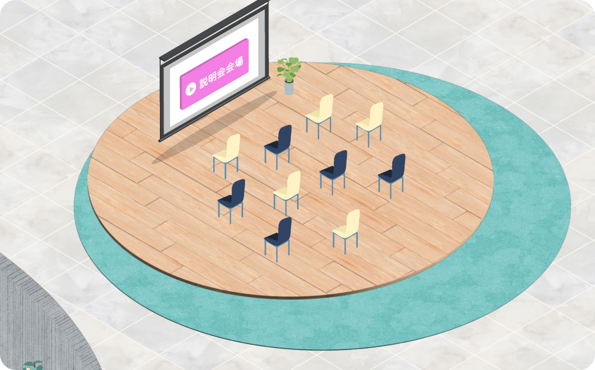座談会や質疑応答形式で参加者が従業員に直接質問できる空間を提供。アバターを使用することによって、お互いに気軽に話しやすくなります。